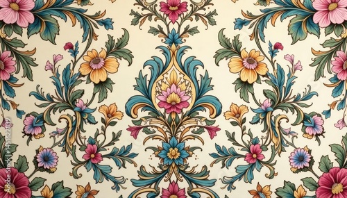 Intricate floral damask pattern in muted tones, repeating, seamless, art