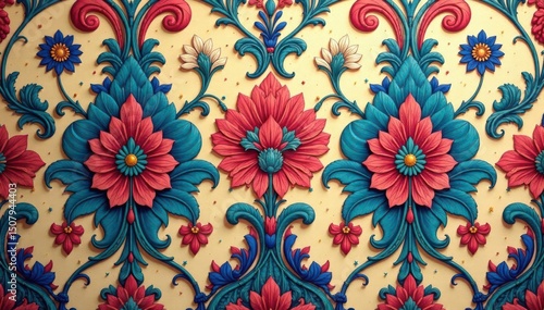 Intricate floral damask wallpaper sample detail, antique, gold