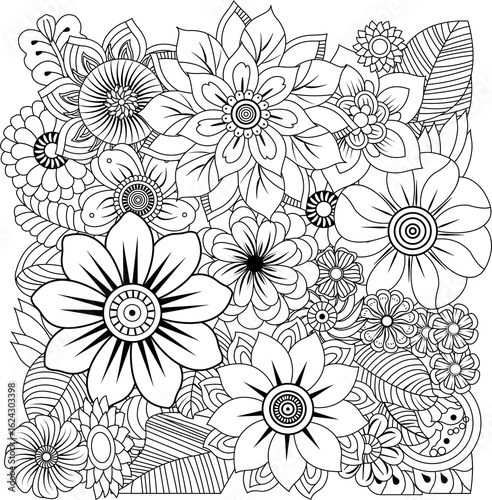 colouring, page, floral, design, flower, pattern, adult, children, art, therapy, relaxation, creative, expression, botanical, nature, drawing, line, detailed, vignetting, black, and, white, outline, printable, hand-drawn, decorative, vintage, flower, garden, wildflower, flower petals, leaf, spring, theme, summer, illustration, beautiful, bloom, artistic, rendering