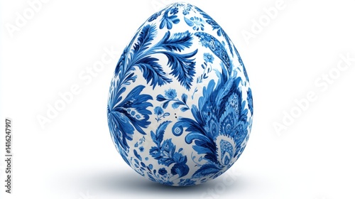 Intricate Floral Egg: Delft Blue Style, Ornamental Decoration on White.