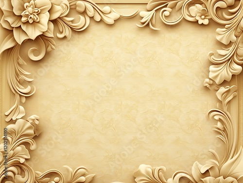 floral, frame, design, elegant, background, art, carving, ornate, relief, sculpture, three-dimensional, rendering, texture, pattern, swirl, leaf, flower, beige, cream, gold, pastel, luxurious, decorative, antique, vintage, baroque, rococo, classic, style, motif, detail, craftsmanship, artistry, sophisticated, intricate, border, accent, element, decoration, illustration, graphic