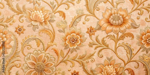 Intricate floral patterns on a soft peach-colored tapestry fabric with golden accents and subtle sheen, creating a warm and cozy atmosphere in any room, peach fabric, traditional design
