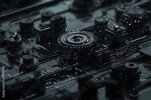 technology, circuit, gear, mechanism, dark, abstract, digital, futuristic, design, innovation, complex, modern, system, engineering, machine, intricate, precise, metal, black, three-dimensional, art