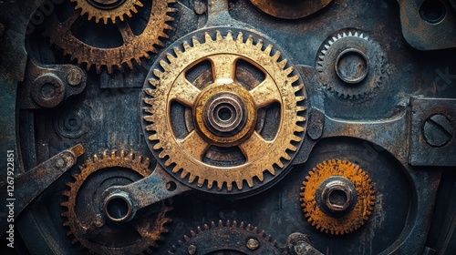 gear, mechanism, clockwork, machinery, metal, technology, industrial, engineering, texture, vintage, antique, rust-eaten, gold, bronze, cog, wheel, interlocking, complex, intricate, detailed, background, pattern, design, machine, component, part, hardware, brass, iron, steel, dark, old, retro, gritty, worn, aesthetic, photo, macro, closeup