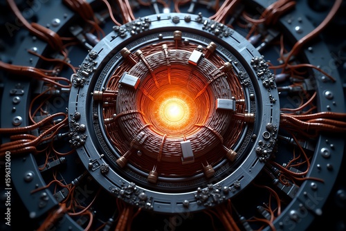 Intricate, glowing core of a complex machine; detailed, futuristic mechanism with intricate wiring and metallic components. AI-generated.