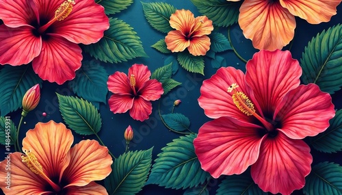 Intricate hibiscus flower pattern, vibrant colors and details , red, exotic