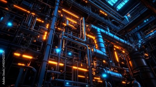 industrial, pipe, metal, structure, glowing, light, complex, factory, machinery, technology, energy, system, engineering, modern, design, futuristic, power, infrastructure, manufacturing, construction, automation, network, systematic, detail, precision, efficient, production, equipment, operation, connected, interconnected, networked, steel, illuminated, bright, dark, industry, powerful, large