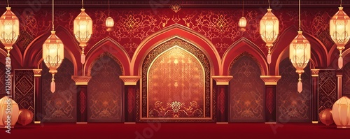 islamic, design, arch, arch, lantern, lantern, pattern, red, gold, wall, elegant, intricate, architecture, decoration, ornate, cultural, traditional, interior, eastern, arabesque, hanging, light, illuminated, shadow, texture, geometric, artistic, vintage, mosque, palace, building, religious, ramadan, eid, celebration, background, luxury, rich, decorative, artwork, illustration, space, empty, stage, column, arabian