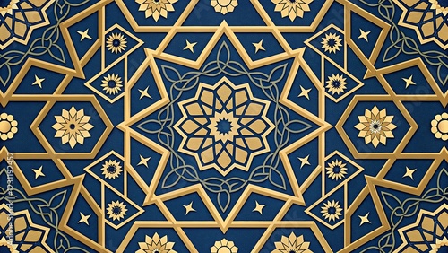 Intricate Islamic geometric design with blue and gold tones, traditional mosaic tile pattern for cultural decor