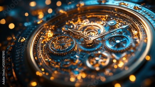 watch, gear, mechanism, time, clockwork, luxury, gold, metal, precision, engineering, intricate, detail, closeup, macro, gold, blue, dark, elegant, sophisticated, expensive, rich, texture, machine, technology, art, craft, design, aesthetic, beauty, craftsmanship, complex, refined, precise, accurate, punctuality, style, opulence, horologe, movement