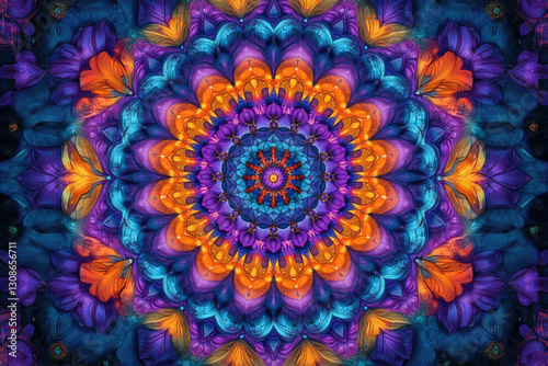 mandala, floral, pattern, symmetric, vibrant, purple, orange, blue, artwork, design, intricate, colourful, hallucinogen, fantasy, art, illustration, digital artwork, graphic design, kaleidoscope, geometry, abstract, cosmic, spiritual, meditation, yoga, peace, calmness, beauty, ornate, detailed, texture, background