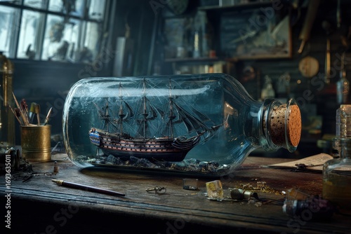 Intricate model ship in a bottle on a cluttered vintage wooden desk, evoking nautical adventure and craftsmanship.