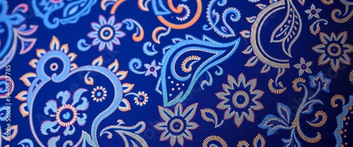 Intricate navy blue paisley textile, close-up detail, vintage, pattern