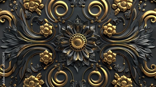Intricate ornamental design featuring flowers and elegant curves in gold and black tones, perfect for luxury decor projects.