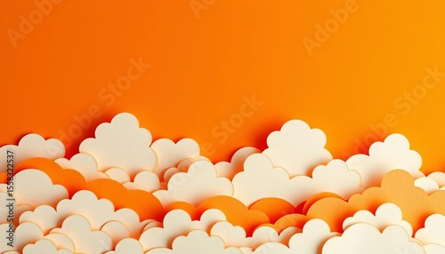 Intricate paper cut orange clouds drift across an orange sky, creating a vibrant, textured scene, layered, wallpaper