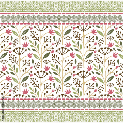 intricate repeat floral pattern with traditional indian border embroidery for textile print