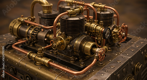 Intricate steampunk engine with brass pipes and gears, showcasing industrial design and vintage machinery