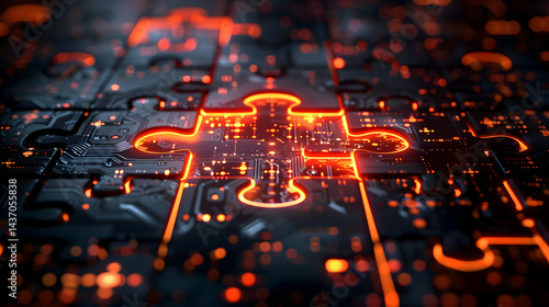 puzzle, piece, technology, circuitry, glowing, illuminated, component, electronic, system, connection, innovation, design, modern, futuristic, abstract, pattern, arrangement, metal, dark, red, orange, light, energy, power, illumination, interface, detail, close, up, grid, structure, complex, integrated, systematic, connection, bright, energetic, dynamic, illuminating