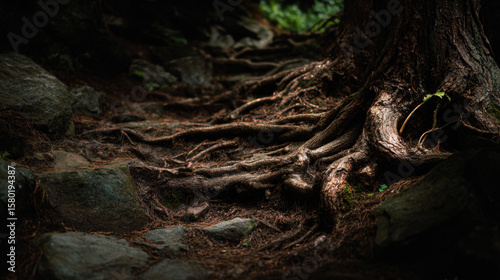 tree, root, forest, nature, wood, texture, earth, path, growth, ground, bark, moss, dark, organic, detail, closeup, environment, wild, natural, landscape, ancient, shadow, sunlight, pathway, surface, root, old, stone, rock, brown, timber, rough, wilderness, scene, trunk, flora, green, forest floor, twig, deep, macro, earthy, pine needle, title