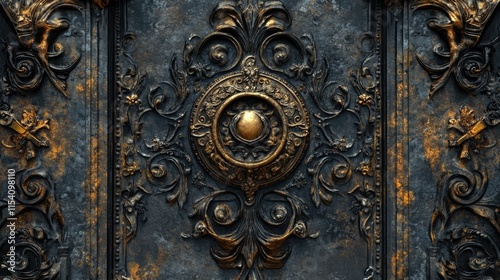 Intricate vintage metalwork design featuring elaborate forged ornaments and a central emblem on a textured ornate gate surface.