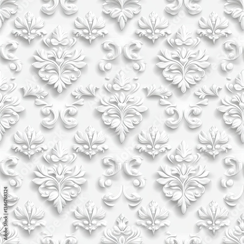 Intricate white damask design adorns a wall, showcasing embossed details in exceptional clarity and realism, highlighting craftsmanship SEAMLESS PATTERN