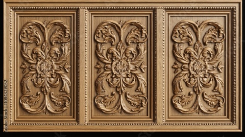 wood, carving, panel, ornate, design, texture, relief, floral, pattern, frame, elegant, decor, art, craft, detail, vintage, classic, luxury, home, interior, architecture, three-dimensional, render, model, brown, wooden, acanthus, leaf, scroll, baroque, rococo, molding, paneling, decoration, surface, artistic, stylish, craftsmanship, element