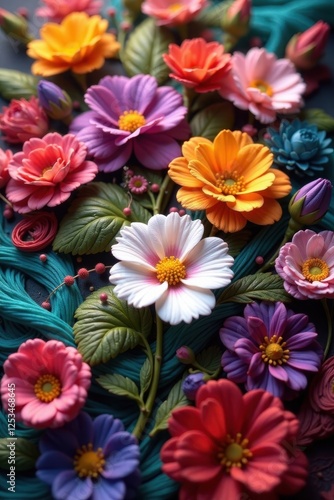 Intricate woven threads, rainbow hues, floral arrangement, bright, braid