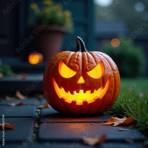 Intricately carved jack-o'-lantern radiates eerie glow on porch , carved, scary