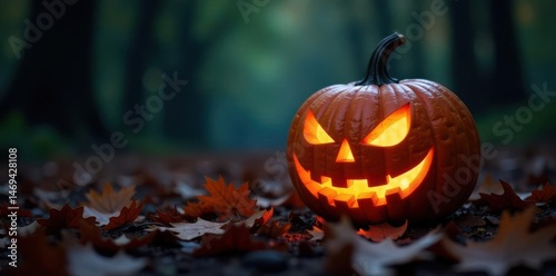 Intricately carved pumpkin radiates eerie glow on fallen leaves Dark forest setting , carved, fall foliage
