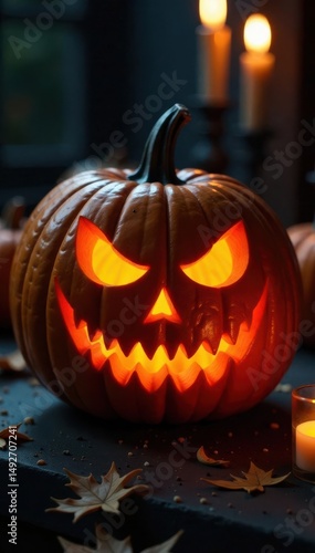 Intricately carved pumpkin with sinister smile, flickering candlelight, wicked, orange