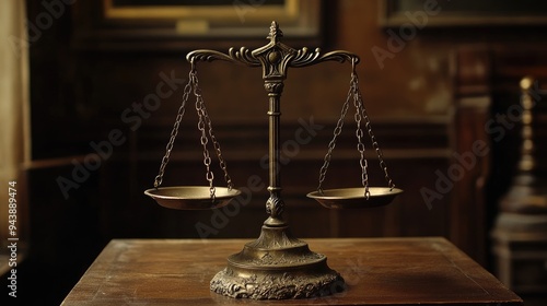 Intricately engraved brass balance scale, aged with patina, under moody lighting, symbolizing justice and historical significance.