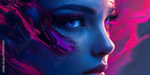 Intriguing Gaze: A close-up portrait of a young woman with piercing blue eyes, bathed in a mesmerizing blend of pink and blue light, creating a captivating and enigmatic atmosphere. The abstract.