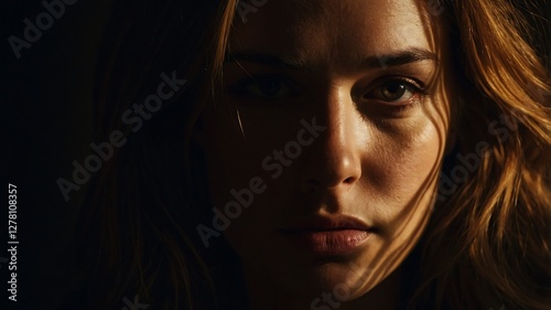 woman, portrait, face, eye, hair, female, girl, model, beauty, fashion, expression, dramatic, light, shadow, dark, intriguing, mysterious, serious, pensive, thoughtful, intense, gaze, look, closeup, studio, photo, image, picture, photo, art, aesthetic, style, mood, emotion, feeling, brown, red, curly, texture, skin