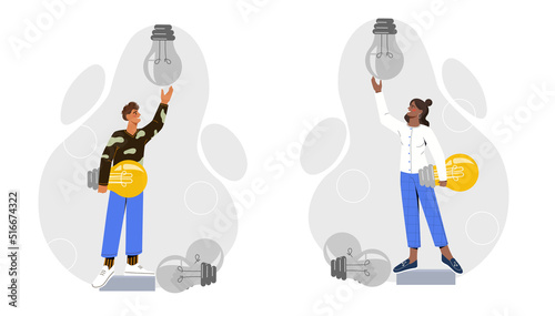 Introduction of innovations. Man and woman entrepreneurs change burned out light bulb to new one. Metaphor for business transformation and new solutions. Cartoon flat vector set isolated on white
