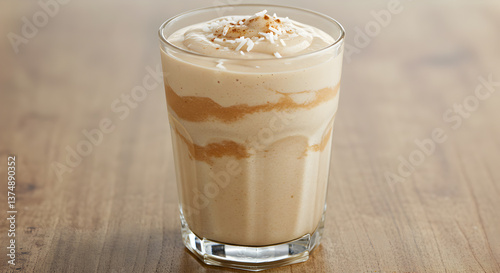 Invigorating coconut chai spice smoothie in glass on wooden table surface