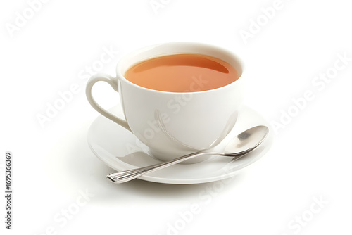 Invigorating hot tea in a clean white cup with a silver spoon on a saucer, perfect for morning refreshment or afternoon relaxation moments