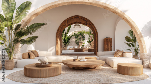 Inviting living room featuring natural textures, archways leading to a verdant garden, and comfortable, neutral-toned seating.