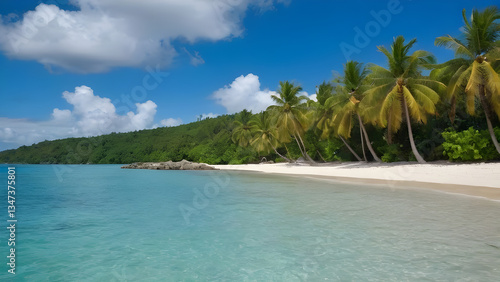 Inviting tropical beach with crystal clear water and palm trees bordering white sand in the Caribbean