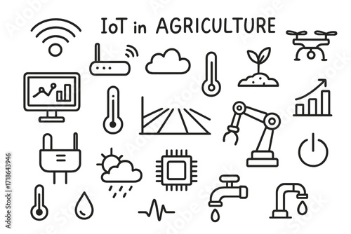 agriculture, icon, hand, drawn, doodle, illustration, signal, icon, wi-fi, hub, drone, plant, datum, screen, cloud, thermometer, graph, field, row, sensor, robot, arm, power, weather, chips, water