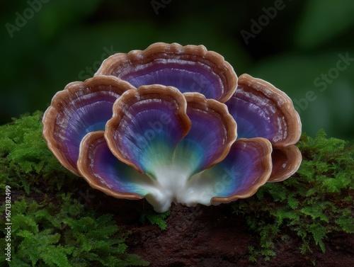 fungal, bracket fungus, iridescent, log, moss, mushroom, wood, plant, nature, forest, flora, wild, growth, macro, closeup, botany, natural, environment, organic, detail, wildlife, no people, nobody, fungal, colours, colourful, vibrant, biology, mycology, outdoors, tree, decay, brown, purple, green