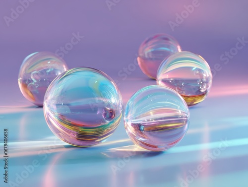 Iridescent Spheres - Abstract Glass Orbs with Pastel Reflections on Glossy Surface.