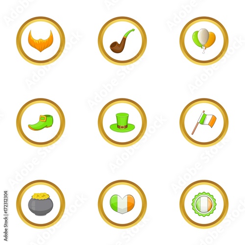 irish, day, icon, 9, set, cartoon, vector, isolated, illustration, signs, symbol, object, collection, balloon, beard, beer, boot, bowler, celebrate, celtic, decoration, design, festive, flag, gold, green, harp, hat, ireland, leaf, leprechaun, lettering, long, luck, march, parade, party, pipe, pot, rainbow, ribbon, shadow, shamrock, sticker, style, traditional