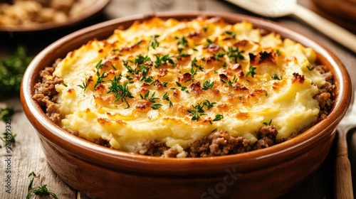 Irish shepherd's pie with mashed potatoes and minced meat in a ceramic dish.