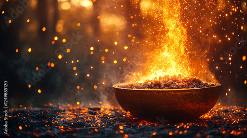 Iron pot with burning charcoal, warm flames, and flying sparks on rustic wood table. Symbolizes warmth, comfort, and coziness in a peaceful environment with a modern bright tone