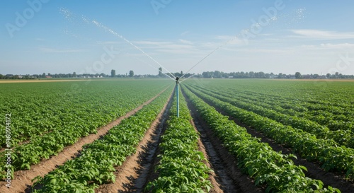 farm, agriculture, potato, irrigation, field, crop, water, sprinkler, row, plant, dirtied, green, landscape, farming, harvest, generating, produce, food, healthy, growth, nature, summer, sunny, daylight, horizon, huge, expanse, technology, system, automated, efficient, sustainable, rural, countryside