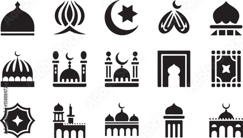 Islamic Cultural and Religious Icons - Mosque Domes, Quran, Crescent Star, and Architectural Symbols