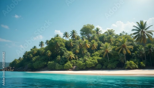 Island Beach with Trees and Turquoise Ocean in Summer Paradise