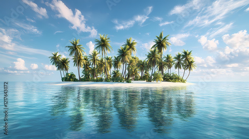 Island in the middle of the ocean with banana trees and coconut trees. Ocean Grove. Illustration