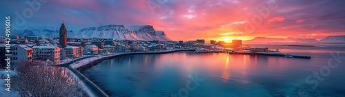 Islandia en foto panorámica, se muestra la ciudad de Reikiavik y sus cielos con auroras boreales. Destino turístico y viajes