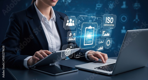 ISO Certification Process: Business Woman with Laptop and Tablet Demonstrating Quality Standards and Compliance in a Modern Office Setting for Microstock
